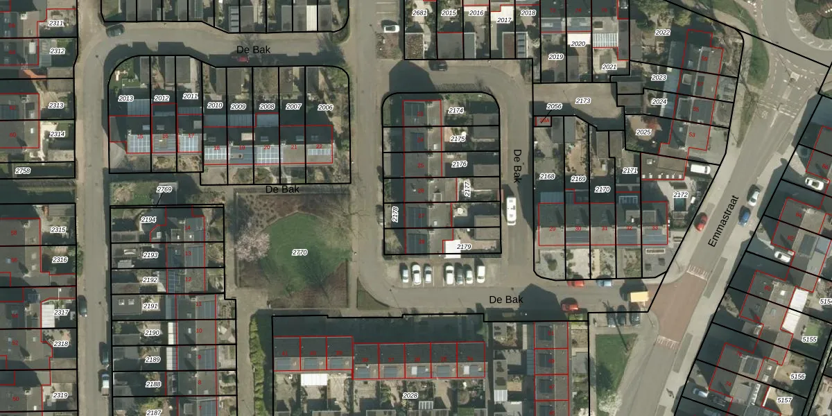 Het perceel waarop De Bak 27 staat heeft een oppervlakte van 172 m². Dit is een middelgroot perceel. De perceeloppervlakte wordt geregistreerd door het Kadaster. Gedetailleerde informatie over de maten van dit perceel kunt u vinden in het rapport Kadastrale kaart met maatvoering van De Bak 27.