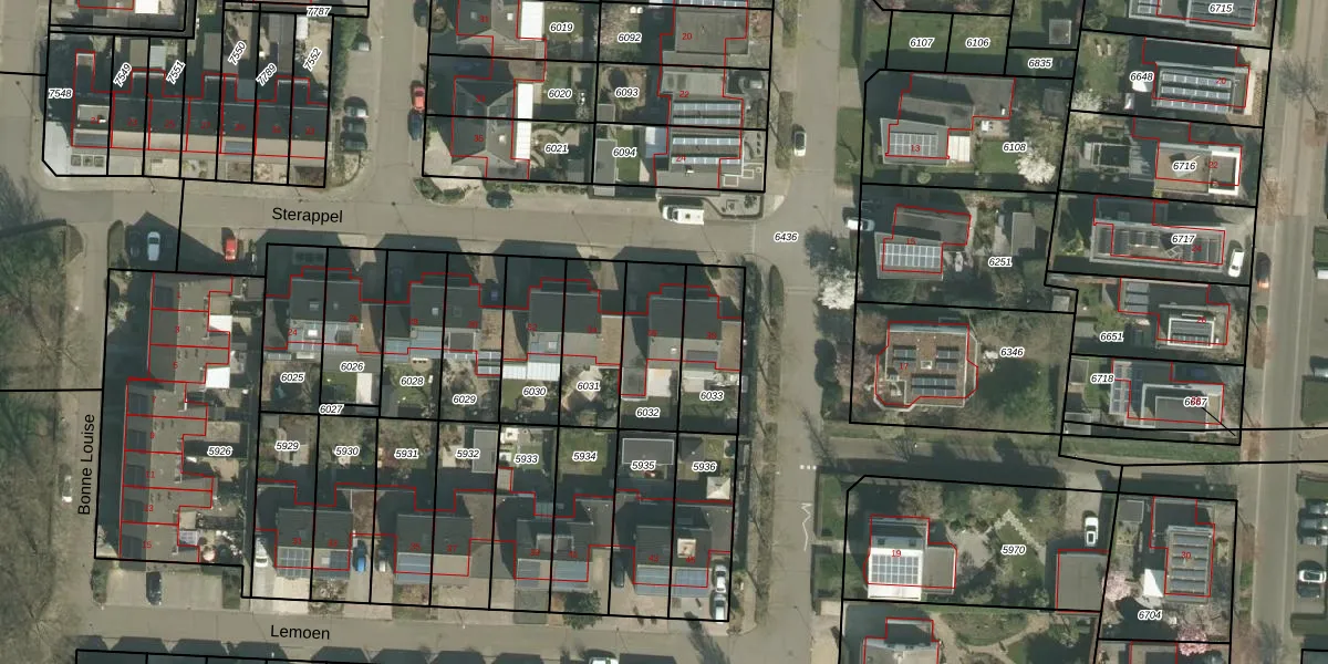 Het perceel waarop Sterappel 36 staat heeft een oppervlakte van 227 m². Dit is een middelgroot perceel. De perceeloppervlakte wordt geregistreerd door het Kadaster. Gedetailleerde informatie over de maten van dit perceel kunt u vinden in het rapport Kadastrale kaart met maatvoering van Sterappel 36.