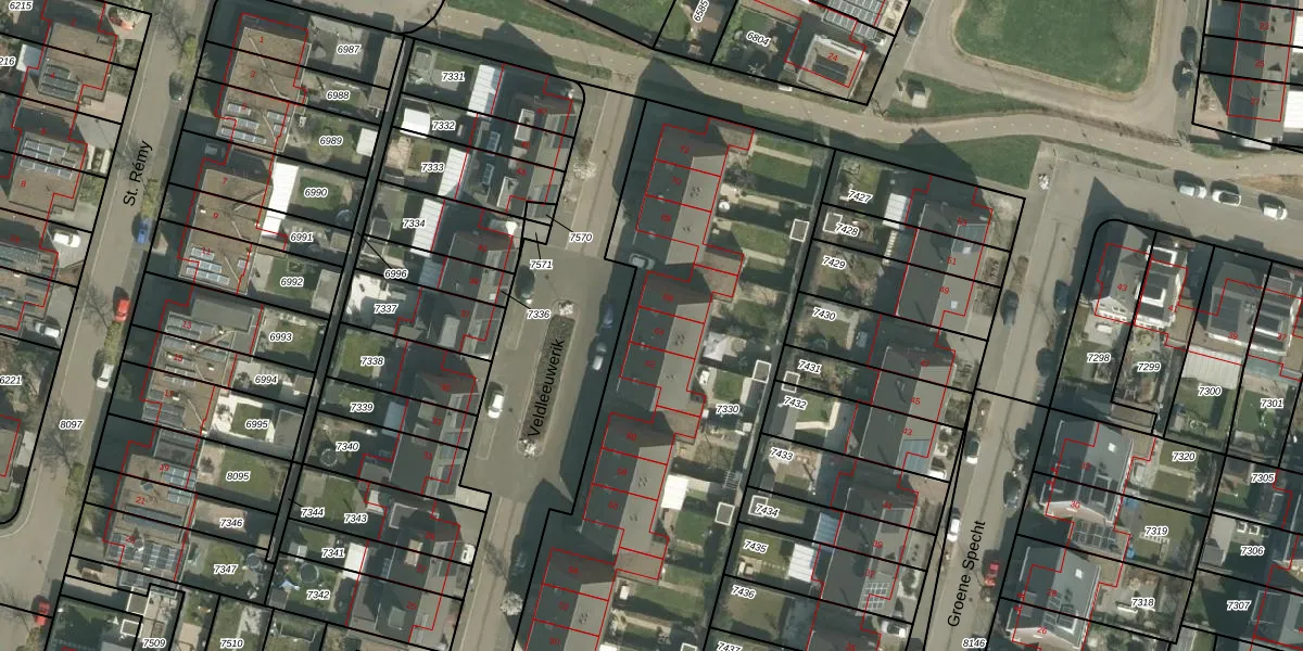 Het perceel waarop Veldleeuwerik 64 staat heeft een oppervlakte van 2460 m². Dit is een zeer groot perceel. De perceeloppervlakte wordt geregistreerd door het Kadaster. Gedetailleerde informatie over de maten van dit perceel kunt u vinden in het rapport Kadastrale kaart met maatvoering van Veldleeuwerik 64.
