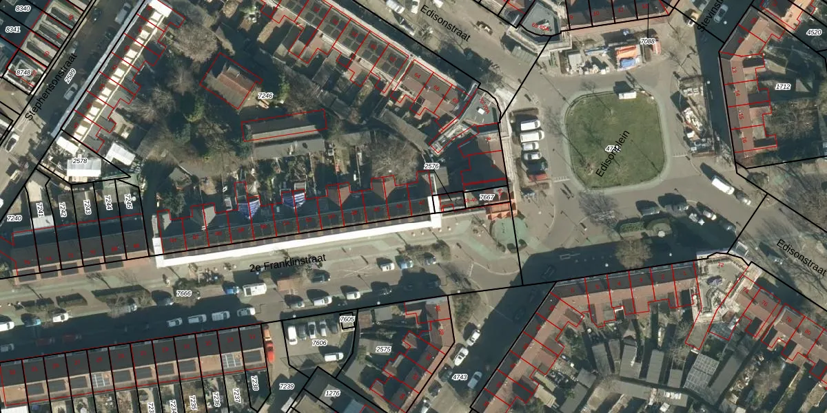 Het perceel waarop 2e Franklinstraat 42 staat heeft een oppervlakte van 5381 m². Dit is een zeer groot perceel. De perceeloppervlakte wordt geregistreerd door het Kadaster. Gedetailleerde informatie over de maten van dit perceel kunt u vinden in het rapport Kadastrale kaart met maatvoering van 2e Franklinstraat 42.