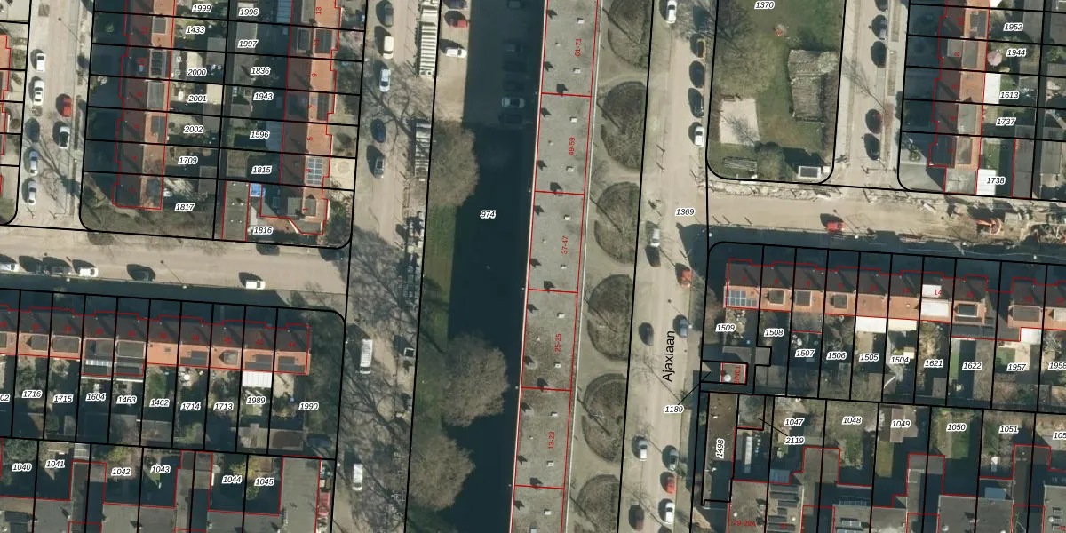 Het perceel waarop Ajaxlaan 37 staat heeft een oppervlakte van 5756 m². Dit is een zeer groot perceel. De perceeloppervlakte wordt geregistreerd door het Kadaster. Gedetailleerde informatie over de maten van dit perceel kunt u vinden in het rapport Kadastrale kaart met maatvoering van Ajaxlaan 37.