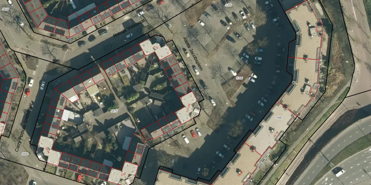Het perceel waarop Aletta Jacobsplein 119 staat heeft een oppervlakte van 5065 m². Dit is een zeer groot perceel. De perceeloppervlakte wordt geregistreerd door het Kadaster. Gedetailleerde informatie over de maten van dit perceel kunt u vinden in het rapport Kadastrale kaart met maatvoering van Aletta Jacobsplein 119.