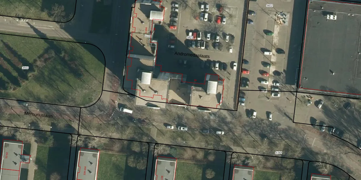 Het perceel waarop Andromedaplaats 102 staat heeft een oppervlakte van 4335 m². Dit is een zeer groot perceel. De perceeloppervlakte wordt geregistreerd door het Kadaster. Gedetailleerde informatie over de maten van dit perceel kunt u vinden in het rapport Kadastrale kaart met maatvoering van Andromedaplaats 102.