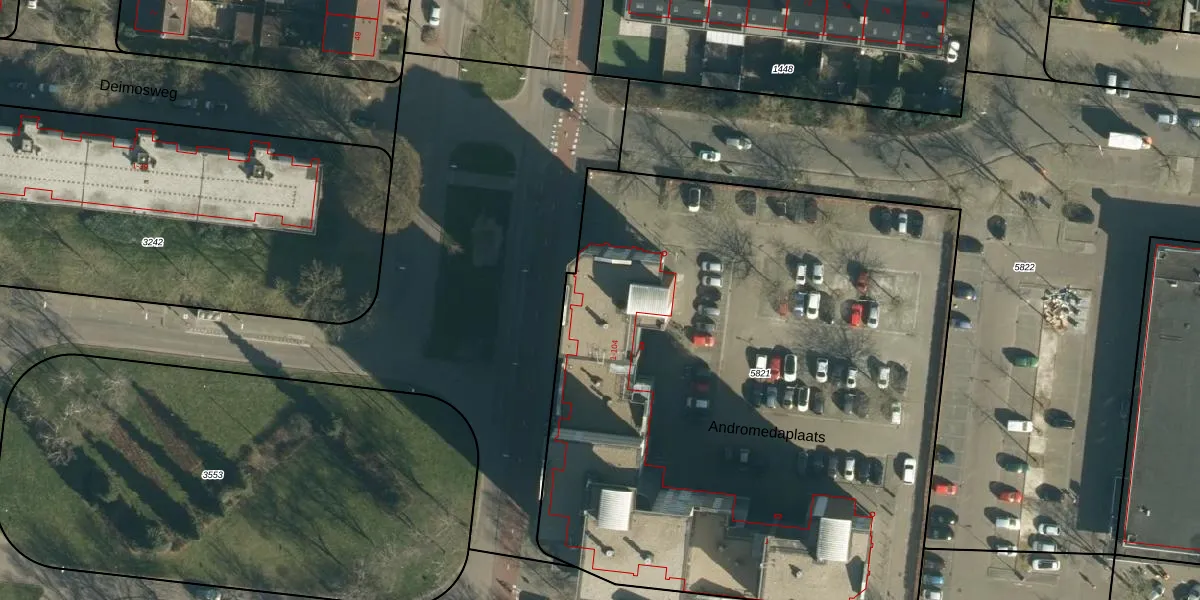 Het perceel waarop Andromedaplaats 16 staat heeft een oppervlakte van 4335 m². Dit is een zeer groot perceel. De perceeloppervlakte wordt geregistreerd door het Kadaster. Gedetailleerde informatie over de maten van dit perceel kunt u vinden in het rapport Kadastrale kaart met maatvoering van Andromedaplaats 16.