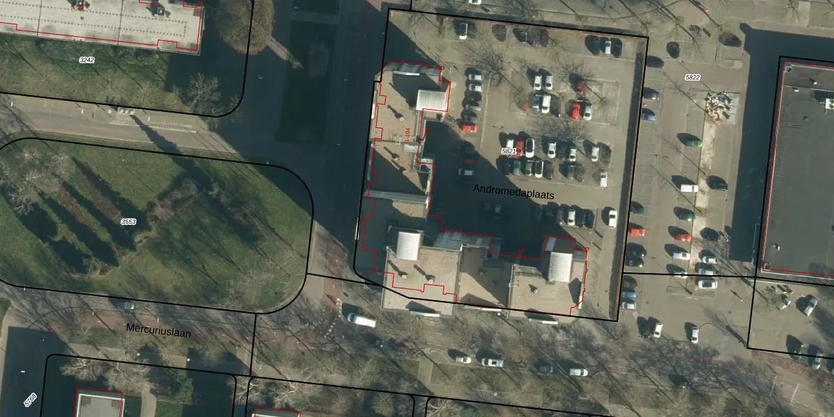 Het perceel waarop Andromedaplaats 66 staat heeft een oppervlakte van 4335 m². Dit is een zeer groot perceel. De perceeloppervlakte wordt geregistreerd door het Kadaster. Gedetailleerde informatie over de maten van dit perceel kunt u vinden in het rapport Kadastrale kaart met maatvoering van Andromedaplaats 66.