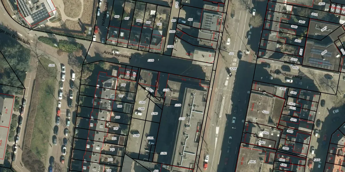 Het perceel waarop Anna Bijnsweg 23 staat heeft een oppervlakte van 1362 m². Dit is een zeer groot perceel. De perceeloppervlakte wordt geregistreerd door het Kadaster. Gedetailleerde informatie over de maten van dit perceel kunt u vinden in het rapport Kadastrale kaart met maatvoering van Anna Bijnsweg 23.