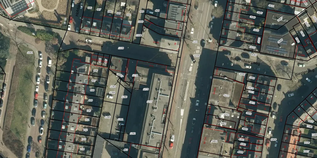 Het perceel waarop Anna Bijnsweg 45 staat heeft een oppervlakte van 1362 m². Dit is een zeer groot perceel. De perceeloppervlakte wordt geregistreerd door het Kadaster. Gedetailleerde informatie over de maten van dit perceel kunt u vinden in het rapport Kadastrale kaart met maatvoering van Anna Bijnsweg 45.