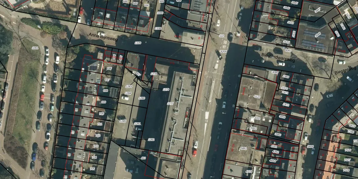Het perceel waarop Anna Bijnsweg 47 staat heeft een oppervlakte van 1362 m². Dit is een zeer groot perceel. De perceeloppervlakte wordt geregistreerd door het Kadaster. Gedetailleerde informatie over de maten van dit perceel kunt u vinden in het rapport Kadastrale kaart met maatvoering van Anna Bijnsweg 47.