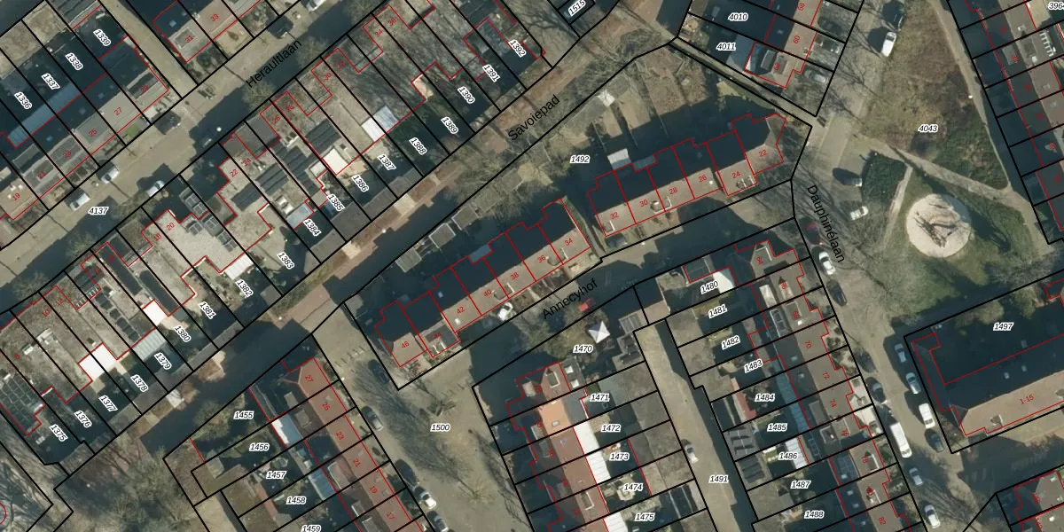 Het perceel waarop Annecyhof 36 staat heeft een oppervlakte van 2233 m². Dit is een zeer groot perceel. De perceeloppervlakte wordt geregistreerd door het Kadaster. Gedetailleerde informatie over de maten van dit perceel kunt u vinden in het rapport Kadastrale kaart met maatvoering van Annecyhof 36.