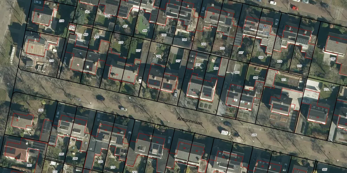Antigonelaan 19 is gelegen op kadastraal perceel WSL01N757. Deze kadastrale aanduiding is uniek en wordt gebruikt door het Kadaster om eigendomsrechten en andere zakelijke rechten vast te leggen. Het perceel maakt onderdeel uit van de kadastrale gemeente Woensel.