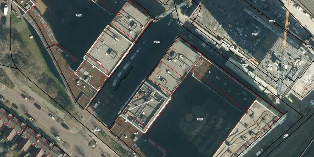 Het perceel waarop Anton Philipslaan 65 staat heeft een oppervlakte van 5868 m². Dit is een zeer groot perceel. De perceeloppervlakte wordt geregistreerd door het Kadaster. Gedetailleerde informatie over de maten van dit perceel kunt u vinden in het rapport Kadastrale kaart met maatvoering van Anton Philipslaan 65.