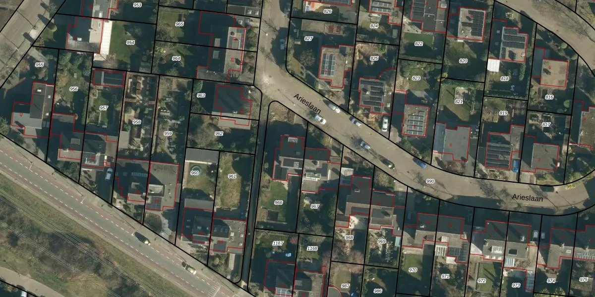 Het perceel waarop Arieslaan 21 staat heeft een oppervlakte van 577 m². Dit is een groot perceel. De perceeloppervlakte wordt geregistreerd door het Kadaster. Gedetailleerde informatie over de maten van dit perceel kunt u vinden in het rapport Kadastrale kaart met maatvoering van Arieslaan 21.