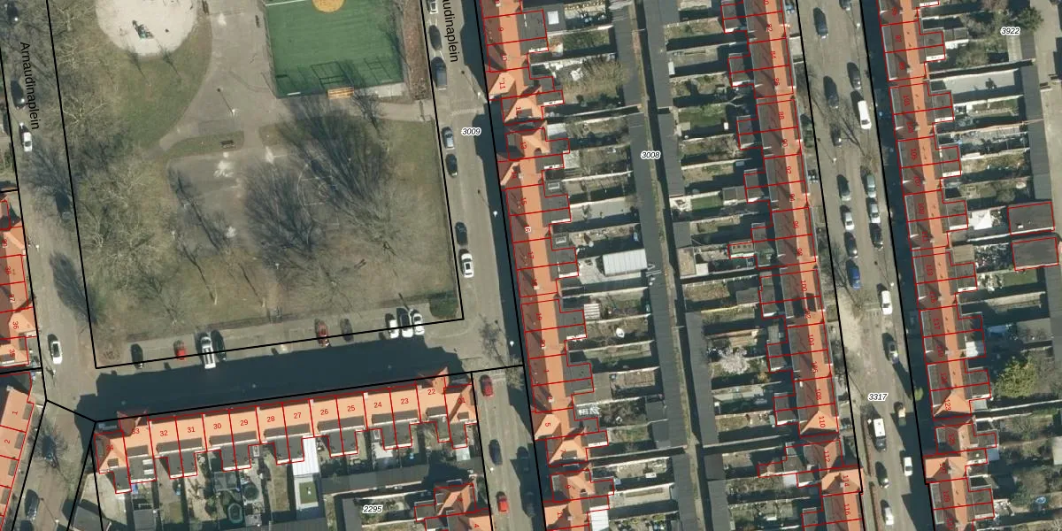Het perceel waarop Arnaudinaplein 17 staat heeft een oppervlakte van 1,3 ha. Dit is een zeer groot perceel. De perceeloppervlakte wordt geregistreerd door het Kadaster. Gedetailleerde informatie over de maten van dit perceel kunt u vinden in het rapport Kadastrale kaart met maatvoering van Arnaudinaplein 17.