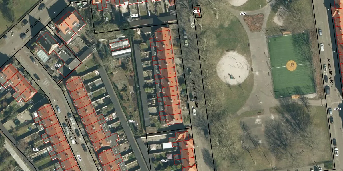 Het perceel waarop Arnaudinaplein 45 staat heeft een oppervlakte van 7859 m². Dit is een zeer groot perceel. De perceeloppervlakte wordt geregistreerd door het Kadaster. Gedetailleerde informatie over de maten van dit perceel kunt u vinden in het rapport Kadastrale kaart met maatvoering van Arnaudinaplein 45.