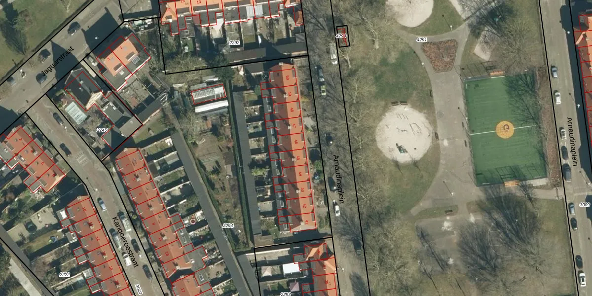 Het perceel waarop Arnaudinaplein 46 staat heeft een oppervlakte van 7859 m². Dit is een zeer groot perceel. De perceeloppervlakte wordt geregistreerd door het Kadaster. Gedetailleerde informatie over de maten van dit perceel kunt u vinden in het rapport Kadastrale kaart met maatvoering van Arnaudinaplein 46.