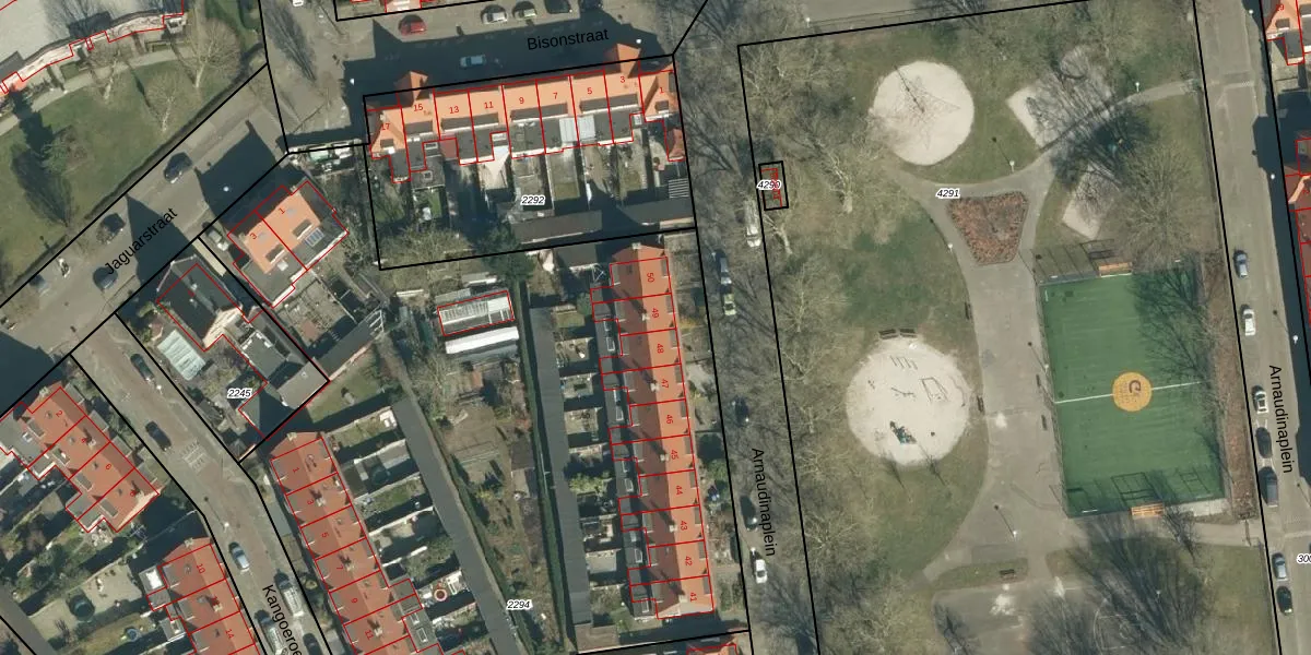 Het perceel waarop Arnaudinaplein 49 staat heeft een oppervlakte van 7859 m². Dit is een zeer groot perceel. De perceeloppervlakte wordt geregistreerd door het Kadaster. Gedetailleerde informatie over de maten van dit perceel kunt u vinden in het rapport Kadastrale kaart met maatvoering van Arnaudinaplein 49.