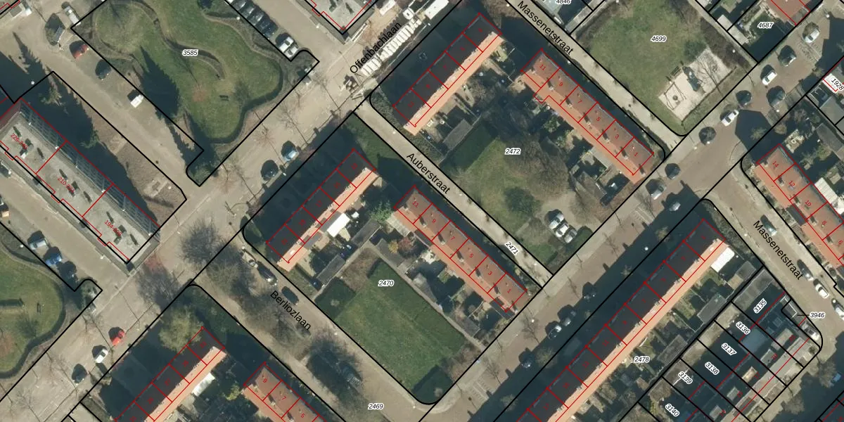 Het perceel waarop Auberstraat 11 staat heeft een oppervlakte van 2464 m². Dit is een zeer groot perceel. De perceeloppervlakte wordt geregistreerd door het Kadaster. Gedetailleerde informatie over de maten van dit perceel kunt u vinden in het rapport Kadastrale kaart met maatvoering van Auberstraat 11.
