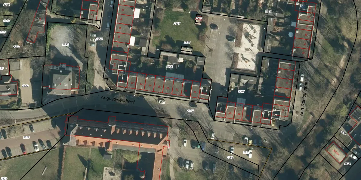 Het perceel waarop Augustijnendreef 22 staat heeft een oppervlakte van 2205 m². Dit is een zeer groot perceel. De perceeloppervlakte wordt geregistreerd door het Kadaster. Gedetailleerde informatie over de maten van dit perceel kunt u vinden in het rapport Kadastrale kaart met maatvoering van Augustijnendreef 22.