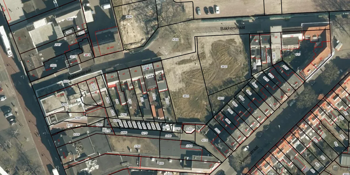 Het perceel waarop Bakkerstraat 39 staat heeft een oppervlakte van 850 m². Dit is een groot perceel. De perceeloppervlakte wordt geregistreerd door het Kadaster. Gedetailleerde informatie over de maten van dit perceel kunt u vinden in het rapport Kadastrale kaart met maatvoering van Bakkerstraat 39.