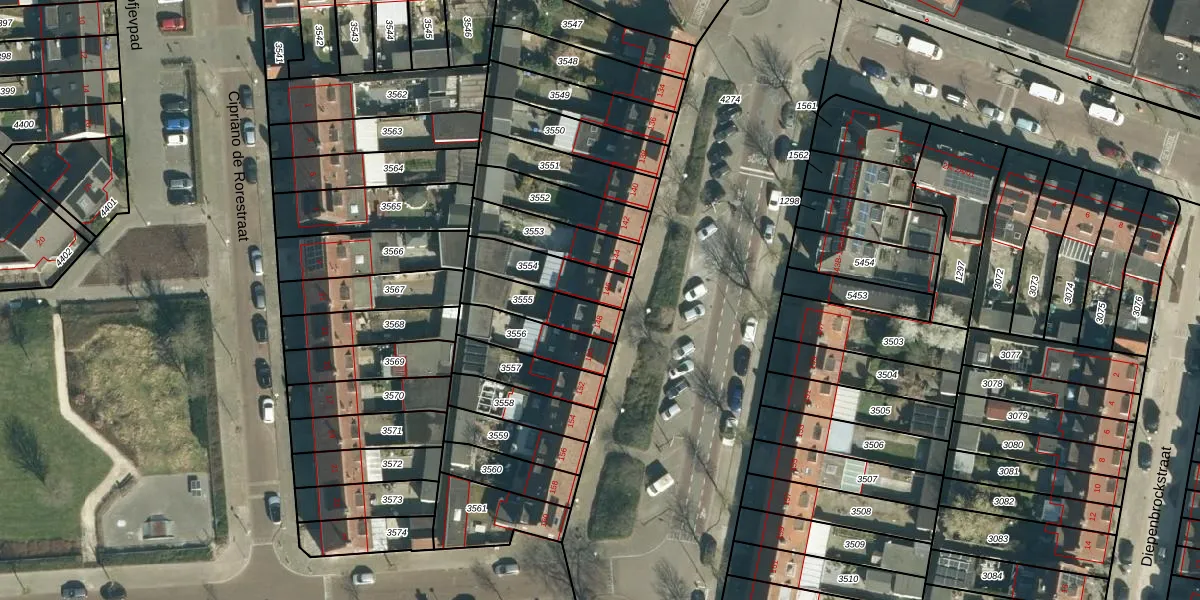 Gebruik de zoekbalk of klik op een perceel voor informatie over de adressen binnen dit perceel.