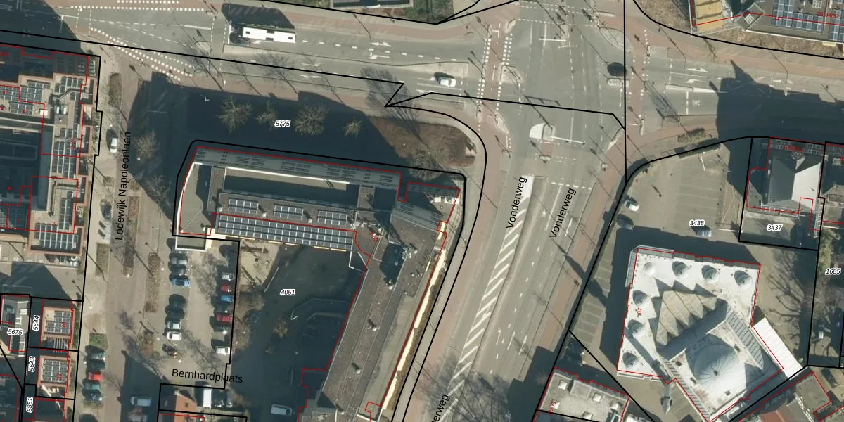 Het perceel waarop Bernhardplaats 55 staat heeft een oppervlakte van 4490 m². Dit is een zeer groot perceel. De perceeloppervlakte wordt geregistreerd door het Kadaster. Gedetailleerde informatie over de maten van dit perceel kunt u vinden in het rapport Kadastrale kaart met maatvoering van Bernhardplaats 55.