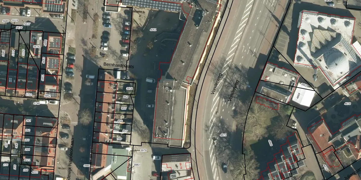 Het perceel waarop Bernhardplaats 75 staat heeft een oppervlakte van 4490 m². Dit is een zeer groot perceel. De perceeloppervlakte wordt geregistreerd door het Kadaster. Gedetailleerde informatie over de maten van dit perceel kunt u vinden in het rapport Kadastrale kaart met maatvoering van Bernhardplaats 75.