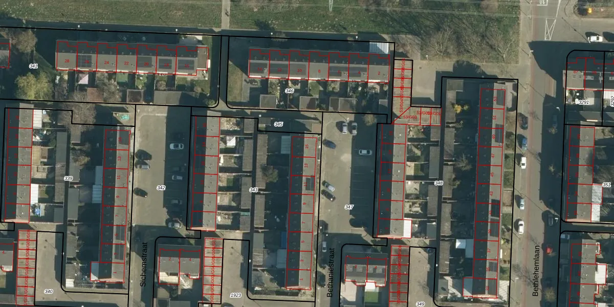 Het perceel waarop Bethaniëstraat 15 staat heeft een oppervlakte van 3860 m². Dit is een zeer groot perceel. De perceeloppervlakte wordt geregistreerd door het Kadaster. Gedetailleerde informatie over de maten van dit perceel kunt u vinden in het rapport Kadastrale kaart met maatvoering van Bethaniëstraat 15.