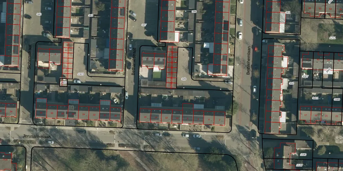 Het perceel waarop Bethlehemlaan 33-G01 staat heeft een oppervlakte van 4736 m². Dit is een zeer groot perceel. De perceeloppervlakte wordt geregistreerd door het Kadaster. Gedetailleerde informatie over de maten van dit perceel kunt u vinden in het rapport Kadastrale kaart met maatvoering van Bethlehemlaan 33-G01.