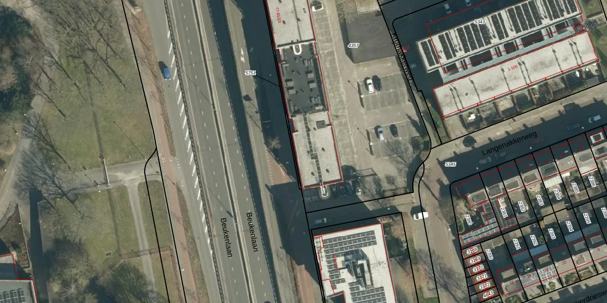 Het perceel waarop Beukenlaan 87-27 staat heeft een oppervlakte van 4594 m². Dit is een zeer groot perceel. De perceeloppervlakte wordt geregistreerd door het Kadaster. Gedetailleerde informatie over de maten van dit perceel kunt u vinden in het rapport Kadastrale kaart met maatvoering van Beukenlaan 87-27.