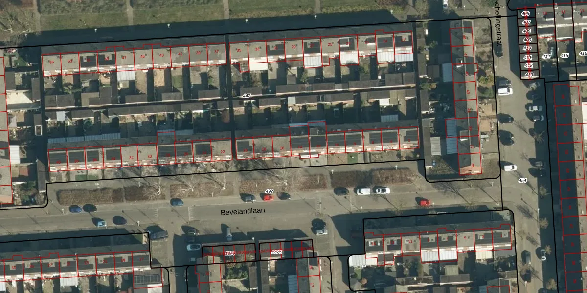 Bevelandlaan 14 is gelegen op kadastraal perceel WSL01R447. Deze kadastrale aanduiding is uniek en wordt gebruikt door het Kadaster om eigendomsrechten en andere zakelijke rechten vast te leggen. Het perceel maakt onderdeel uit van de kadastrale gemeente Woensel.