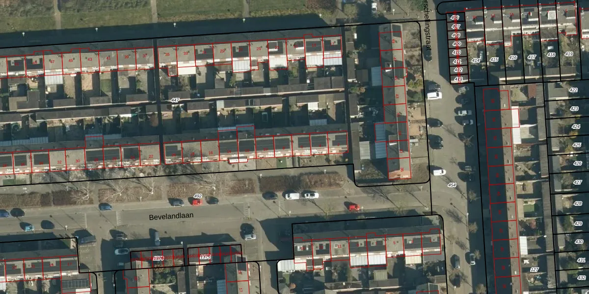 Bevelandlaan 6 is gelegen op kadastraal perceel WSL01R447. Deze kadastrale aanduiding is uniek en wordt gebruikt door het Kadaster om eigendomsrechten en andere zakelijke rechten vast te leggen. Het perceel maakt onderdeel uit van de kadastrale gemeente Woensel.