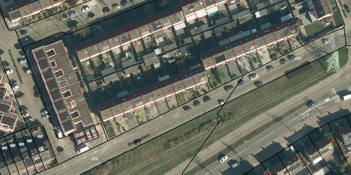 Biesboslaan 24 is gelegen op kadastraal perceel WSL01R333. Deze kadastrale aanduiding is uniek en wordt gebruikt door het Kadaster om eigendomsrechten en andere zakelijke rechten vast te leggen. Het perceel maakt onderdeel uit van de kadastrale gemeente Woensel.