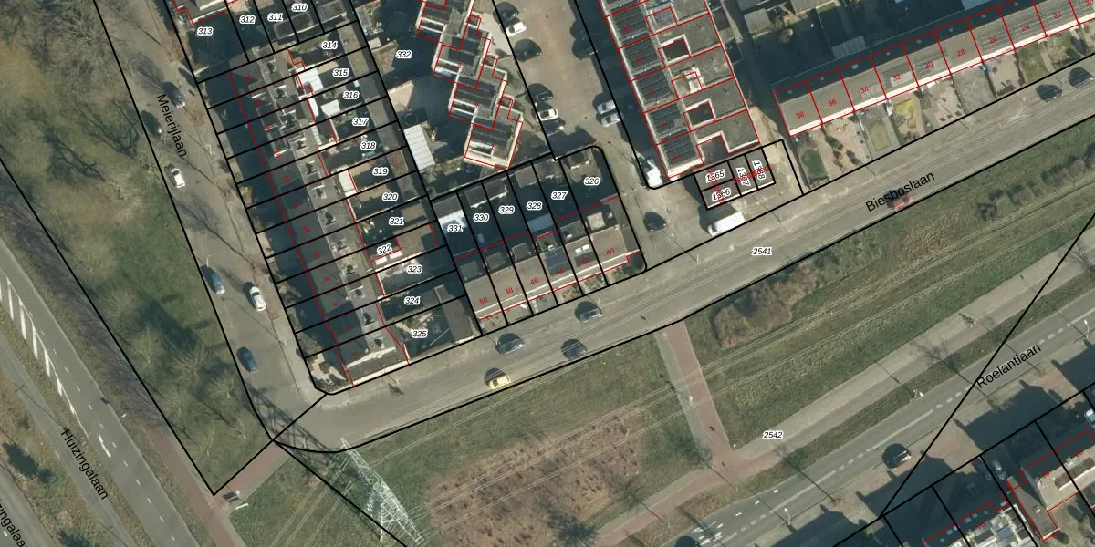 Biesboslaan 44 is gelegen op kadastraal perceel WSL01R328. Deze kadastrale aanduiding is uniek en wordt gebruikt door het Kadaster om eigendomsrechten en andere zakelijke rechten vast te leggen. Het perceel maakt onderdeel uit van de kadastrale gemeente Woensel.