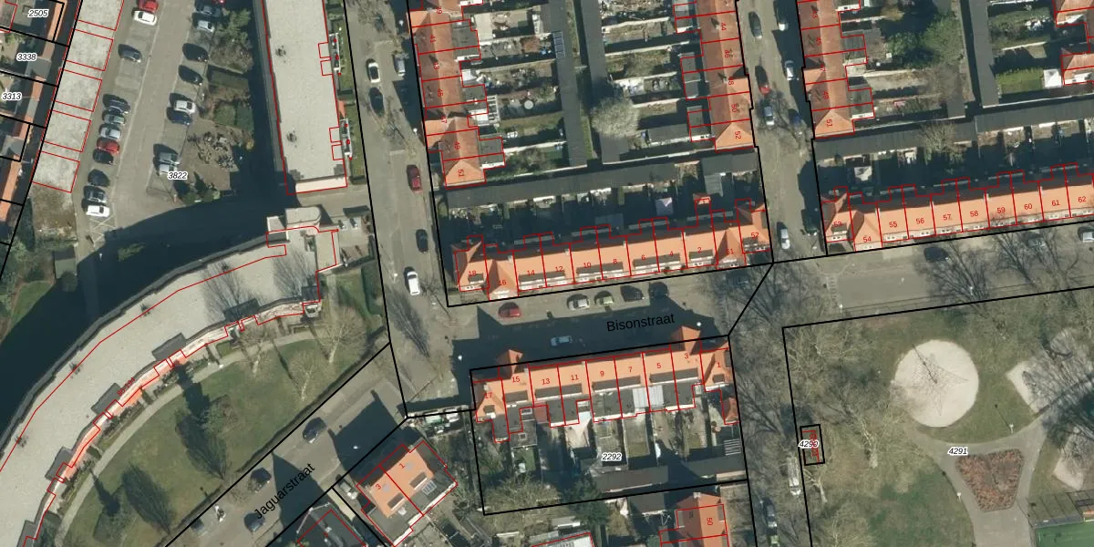 Het perceel waarop Bisonstraat 12 staat heeft een oppervlakte van 1,0 ha. Dit is een zeer groot perceel. De perceeloppervlakte wordt geregistreerd door het Kadaster. Gedetailleerde informatie over de maten van dit perceel kunt u vinden in het rapport Kadastrale kaart met maatvoering van Bisonstraat 12.