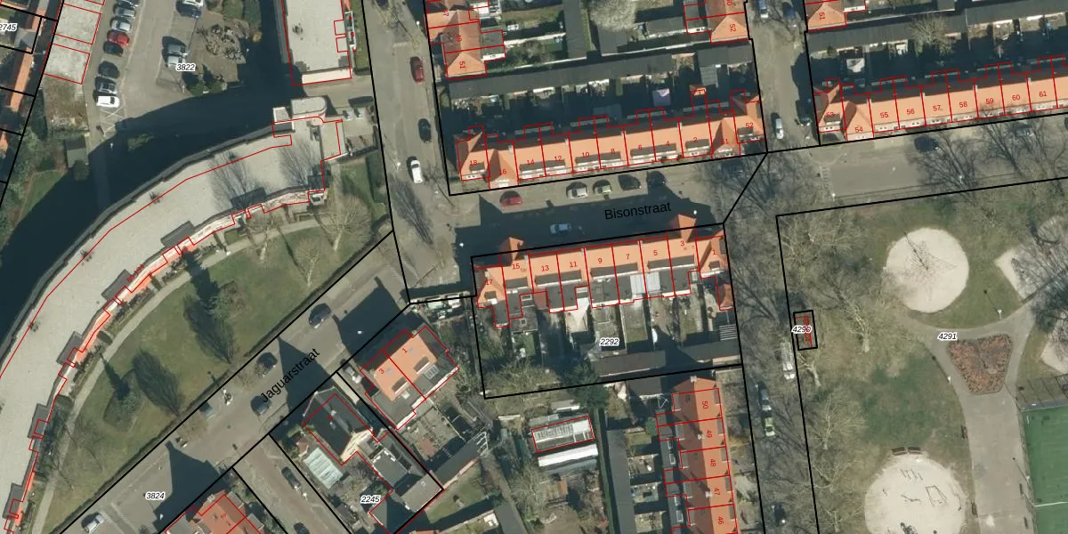 Het perceel waarop Bisonstraat 13 staat heeft een oppervlakte van 1287 m². Dit is een zeer groot perceel. De perceeloppervlakte wordt geregistreerd door het Kadaster. Gedetailleerde informatie over de maten van dit perceel kunt u vinden in het rapport Kadastrale kaart met maatvoering van Bisonstraat 13.