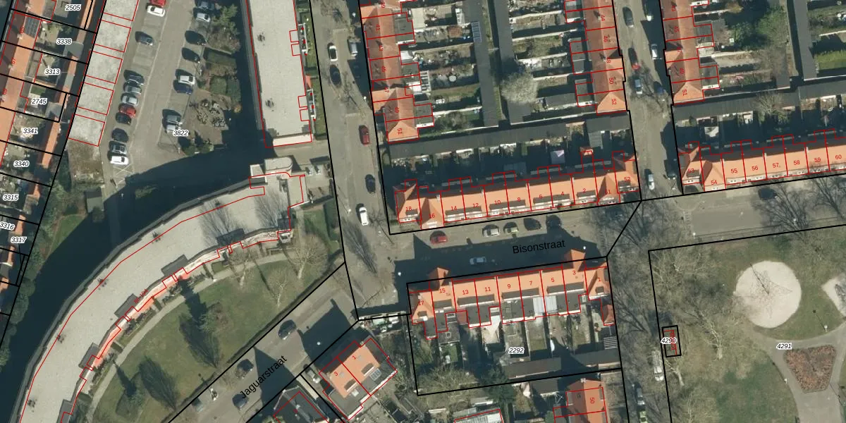 Het perceel waarop Bisonstraat 16 staat heeft een oppervlakte van 1,0 ha. Dit is een zeer groot perceel. De perceeloppervlakte wordt geregistreerd door het Kadaster. Gedetailleerde informatie over de maten van dit perceel kunt u vinden in het rapport Kadastrale kaart met maatvoering van Bisonstraat 16.