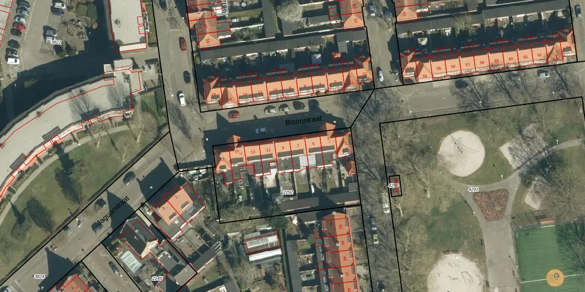 Het perceel waarop Bisonstraat 7 staat heeft een oppervlakte van 1287 m². Dit is een zeer groot perceel. De perceeloppervlakte wordt geregistreerd door het Kadaster. Gedetailleerde informatie over de maten van dit perceel kunt u vinden in het rapport Kadastrale kaart met maatvoering van Bisonstraat 7.