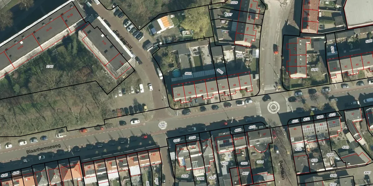 Het perceel waarop Blaarthemseweg 56 staat heeft een oppervlakte van 1002 m². Dit is een zeer groot perceel. De perceeloppervlakte wordt geregistreerd door het Kadaster. Gedetailleerde informatie over de maten van dit perceel kunt u vinden in het rapport Kadastrale kaart met maatvoering van Blaarthemseweg 56.