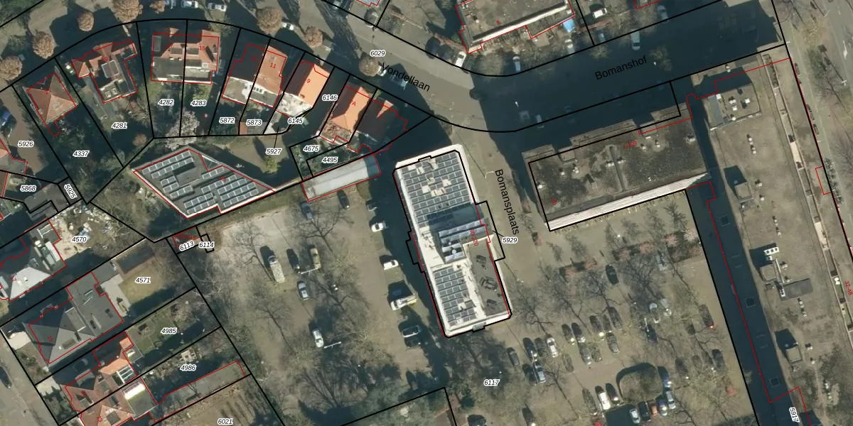 Het perceel waarop Bomansplaats 106 staat heeft een oppervlakte van 722 m². Dit is een groot perceel. De perceeloppervlakte wordt geregistreerd door het Kadaster. Gedetailleerde informatie over de maten van dit perceel kunt u vinden in het rapport Kadastrale kaart met maatvoering van Bomansplaats 106.