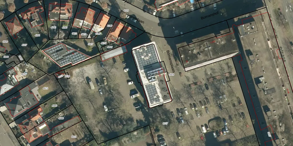 Het perceel waarop Bomansplaats 107 staat heeft een oppervlakte van 722 m². Dit is een groot perceel. De perceeloppervlakte wordt geregistreerd door het Kadaster. Gedetailleerde informatie over de maten van dit perceel kunt u vinden in het rapport Kadastrale kaart met maatvoering van Bomansplaats 107.