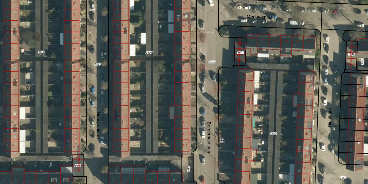 Borgerhoutlaan 35 is gelegen op kadastraal perceel WSL01M1605. Deze kadastrale aanduiding is uniek en wordt gebruikt door het Kadaster om eigendomsrechten en andere zakelijke rechten vast te leggen. Het perceel maakt onderdeel uit van de kadastrale gemeente Woensel.