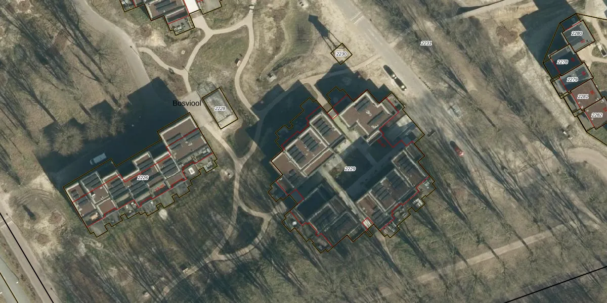 Het perceel waarop Bosuil 39 staat heeft een oppervlakte van 2012 m². Dit is een zeer groot perceel. De perceeloppervlakte wordt geregistreerd door het Kadaster. Gedetailleerde informatie over de maten van dit perceel kunt u vinden in het rapport Kadastrale kaart met maatvoering van Bosuil 39.