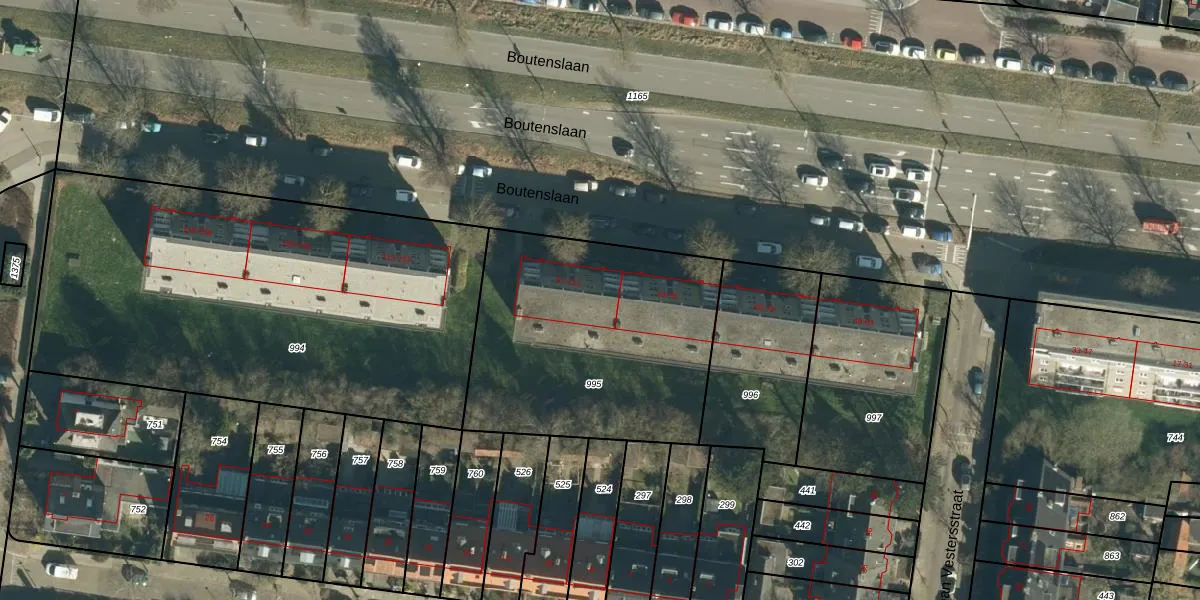 Het perceel waarop Boutenslaan 105 staat heeft een oppervlakte van 1270 m². Dit is een zeer groot perceel. De perceeloppervlakte wordt geregistreerd door het Kadaster. Gedetailleerde informatie over de maten van dit perceel kunt u vinden in het rapport Kadastrale kaart met maatvoering van Boutenslaan 105.