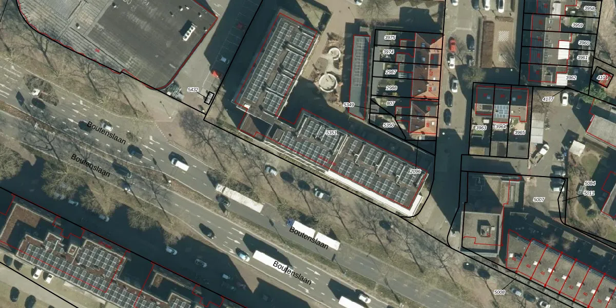 Het perceel waarop Boutenslaan 54-93 staat heeft een oppervlakte van 3569 m². Dit is een zeer groot perceel. De perceeloppervlakte wordt geregistreerd door het Kadaster. Gedetailleerde informatie over de maten van dit perceel kunt u vinden in het rapport Kadastrale kaart met maatvoering van Boutenslaan 54-93.