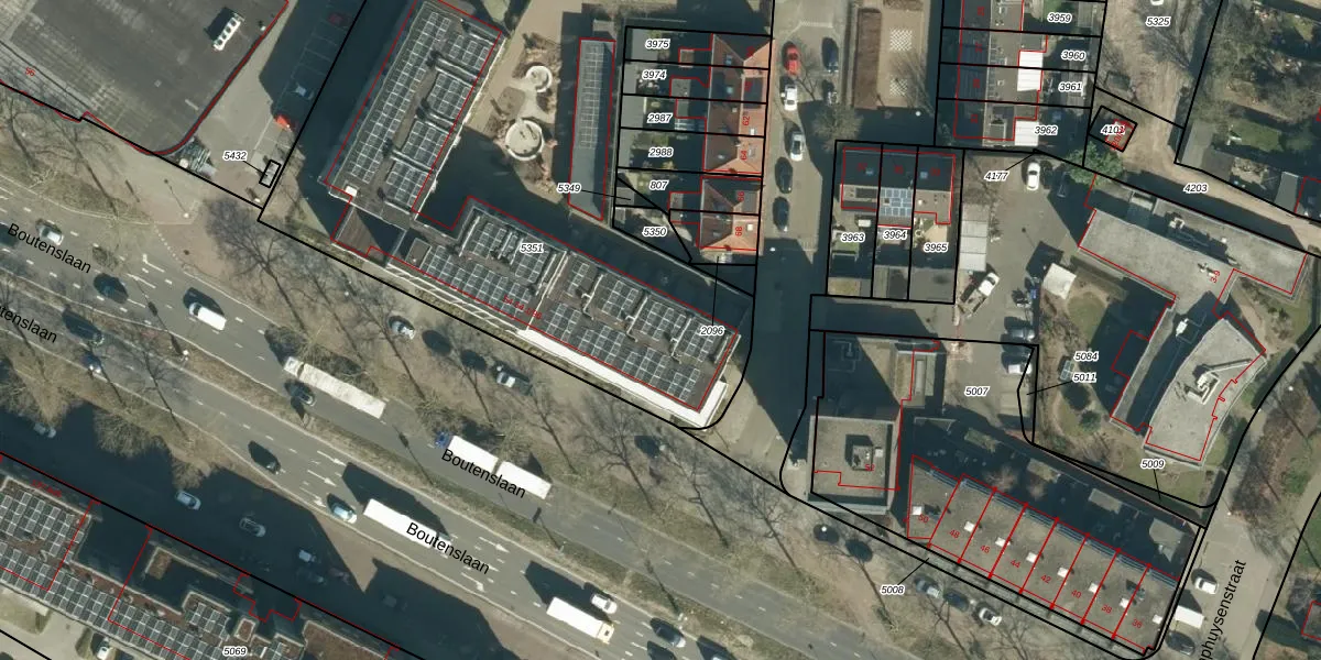 Het perceel waarop Boutenslaan 54-23 staat heeft een oppervlakte van 3569 m². Dit is een zeer groot perceel. De perceeloppervlakte wordt geregistreerd door het Kadaster. Gedetailleerde informatie over de maten van dit perceel kunt u vinden in het rapport Kadastrale kaart met maatvoering van Boutenslaan 54-23.