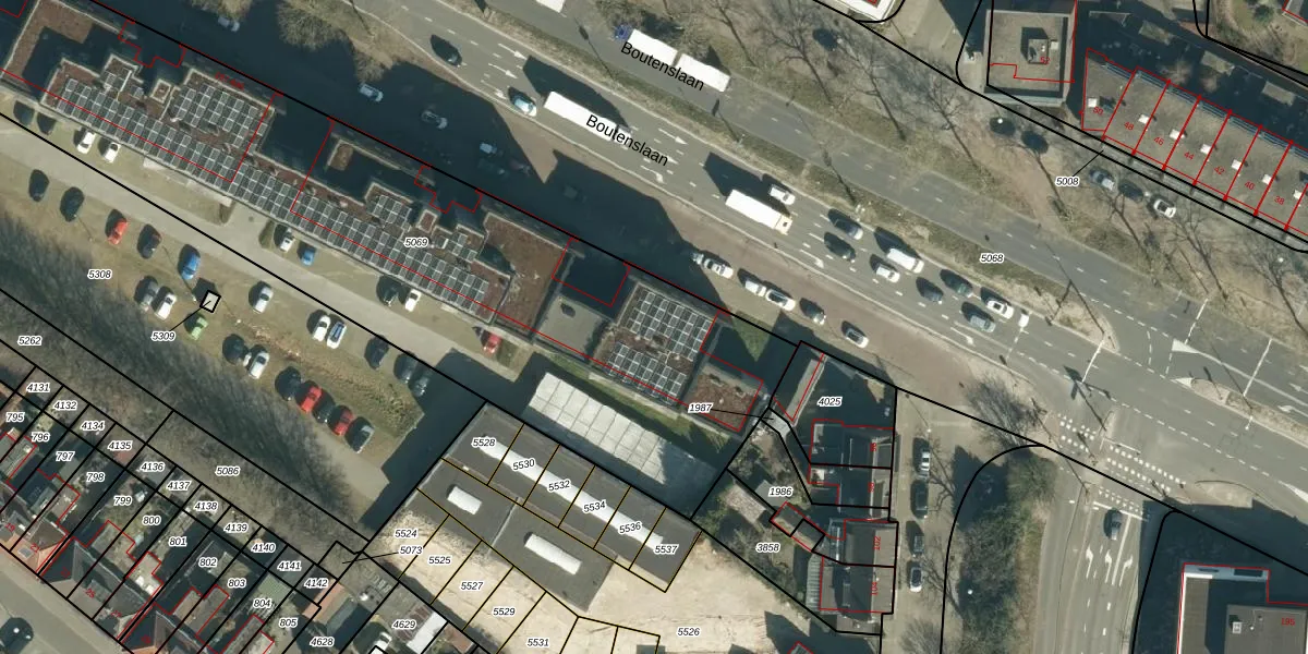 Boutenslaan 597 is gelegen op kadastraal perceel GTL01C5069. Deze kadastrale aanduiding is uniek en wordt gebruikt door het Kadaster om eigendomsrechten en andere zakelijke rechten vast te leggen. Het perceel maakt onderdeel uit van de kadastrale gemeente Gestel.
