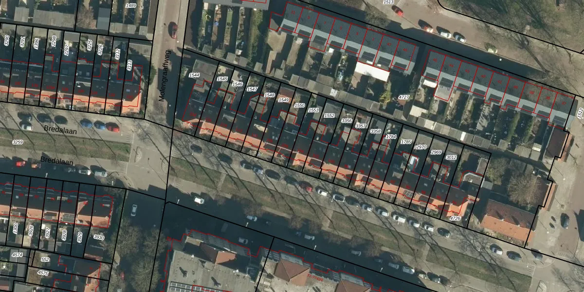 Bredalaan 106 is gelegen op kadastraal perceel STR03C1550. Deze kadastrale aanduiding is uniek en wordt gebruikt door het Kadaster om eigendomsrechten en andere zakelijke rechten vast te leggen. Het perceel maakt onderdeel uit van de kadastrale gemeente Strijp.