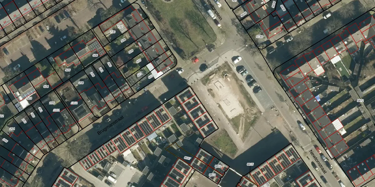 Het perceel waarop Brugmanstraat 1 staat heeft een oppervlakte van 5512 m². Dit is een zeer groot perceel. De perceeloppervlakte wordt geregistreerd door het Kadaster. Gedetailleerde informatie over de maten van dit perceel kunt u vinden in het rapport Kadastrale kaart met maatvoering van Brugmanstraat 1.