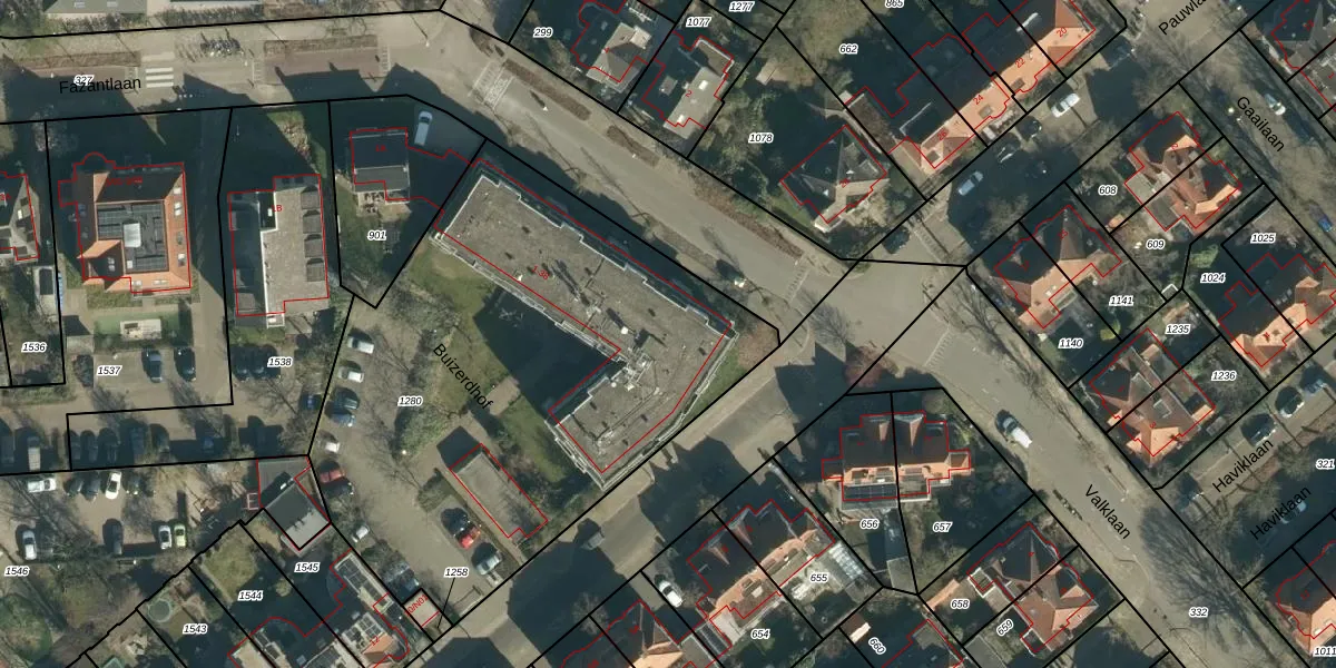 Het perceel waarop Buizerdhof 16 staat heeft een oppervlakte van 2770 m². Dit is een zeer groot perceel. De perceeloppervlakte wordt geregistreerd door het Kadaster. Gedetailleerde informatie over de maten van dit perceel kunt u vinden in het rapport Kadastrale kaart met maatvoering van Buizerdhof 16.