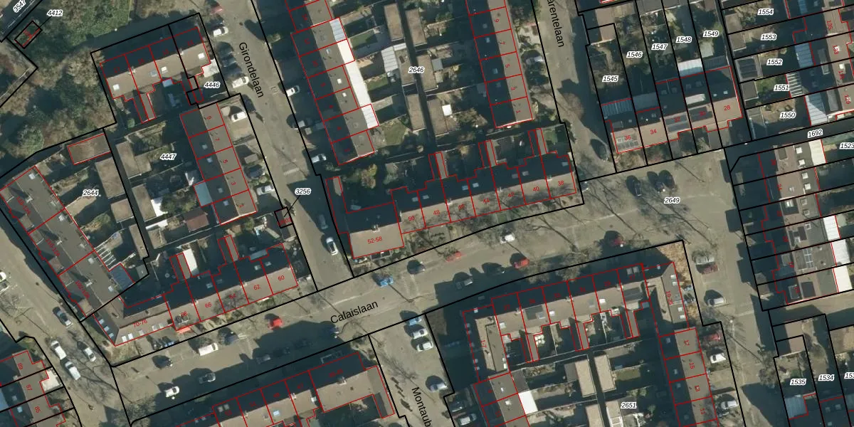 Het perceel waarop Calaislaan 48 staat heeft een oppervlakte van 4372 m². Dit is een zeer groot perceel. De perceeloppervlakte wordt geregistreerd door het Kadaster. Gedetailleerde informatie over de maten van dit perceel kunt u vinden in het rapport Kadastrale kaart met maatvoering van Calaislaan 48.
